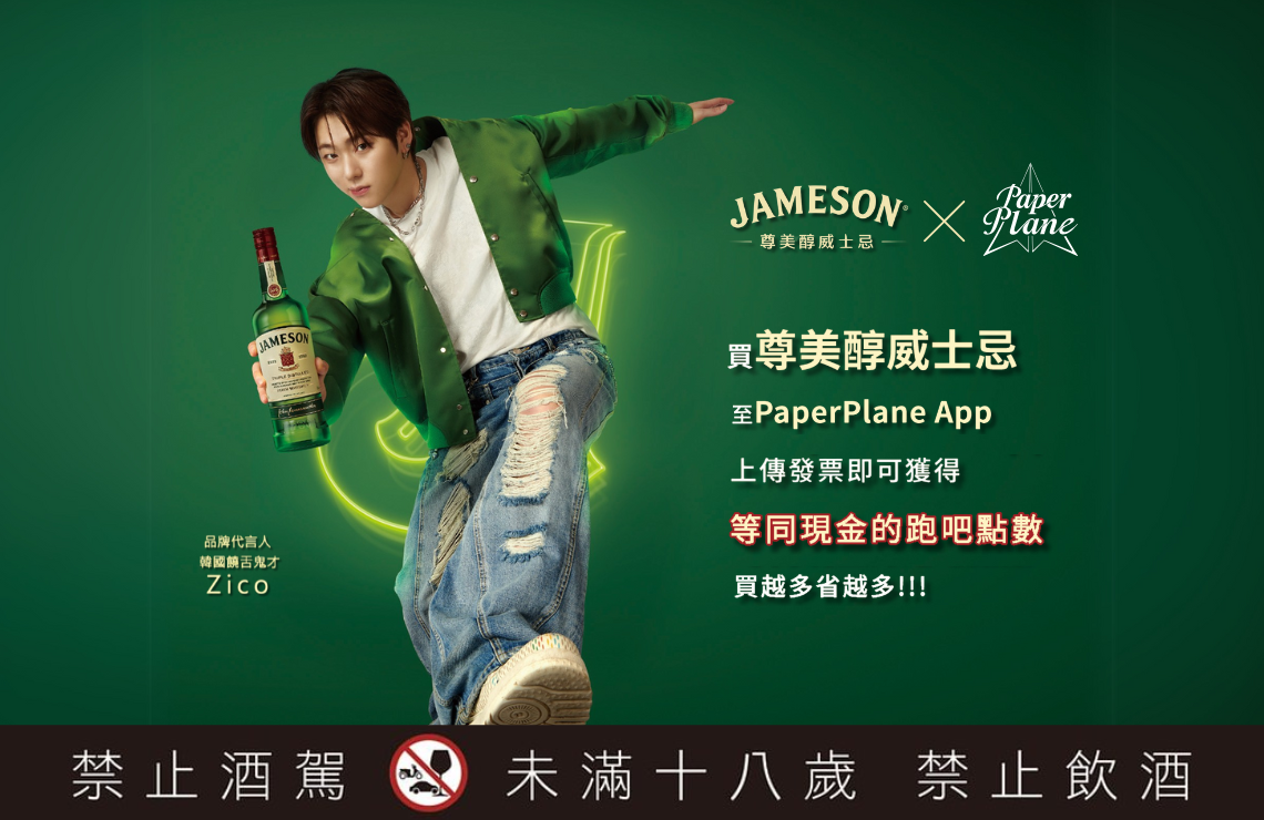 - 獎勵機制:購買 Jameson 尊美醇,登錄發票即可獲得 PaperPlane 跑吧點數